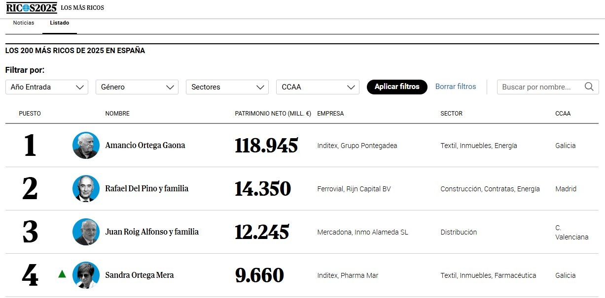 Las 200 mayores fortunas de España avanzan a doble dígito por segundo año consecutivo y suman 373.000 millones, un 53% más que antes de la pandemia. Amancio Ortega y su familia acaparan la mitad del crecimiento. Los catalanes Puig ingresan en el ‘top 10’. Jon Rahm, entre las 16 novedades, segundo deportista entre los más ricos Leer